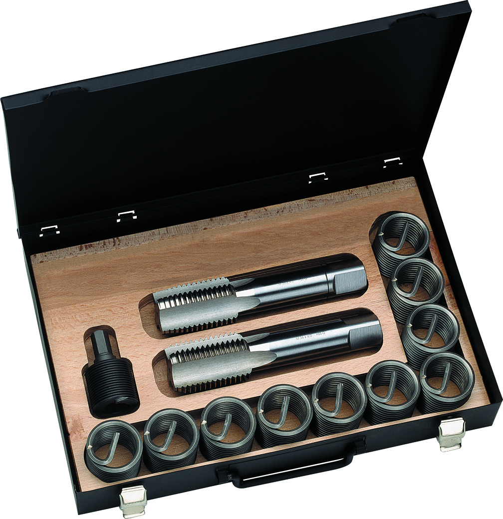 Schroefdraadreparatieset voor reparatie van beschadigd schroefdraad. Complete set met; tap, inbouwhulpstuk en schroefdraadinserts.